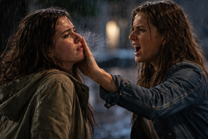 Não foi um tapa qualquer. Foi daqueles que saem com o peso de anos engolidos, de frases não ditas, de lágrimas escondidas no banho, de raiva misturada com amor. O bar da esquina ainda tocava sertanejo baixo, a água escorria da marquise quebrada, e as duas, encharcadas, pareciam duas estranhas brigando no meio da calçada.